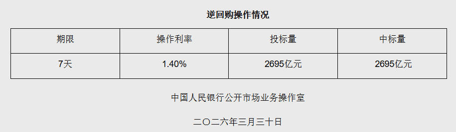3月30日电 据央止网站新闻,2026年3月30日中原群众银止以牢固利率、数目投标体例启铺了2695亿元7天期顺归买操纵。详细环境以下: